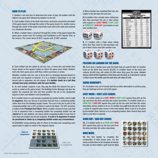 The exciting home building board game that will keep everyone entertained! Follow the easy step-by-step instructions to complete the construction of your home before a competing builder does! With endless fun and learning opportunities, this game is suited for all ages!
